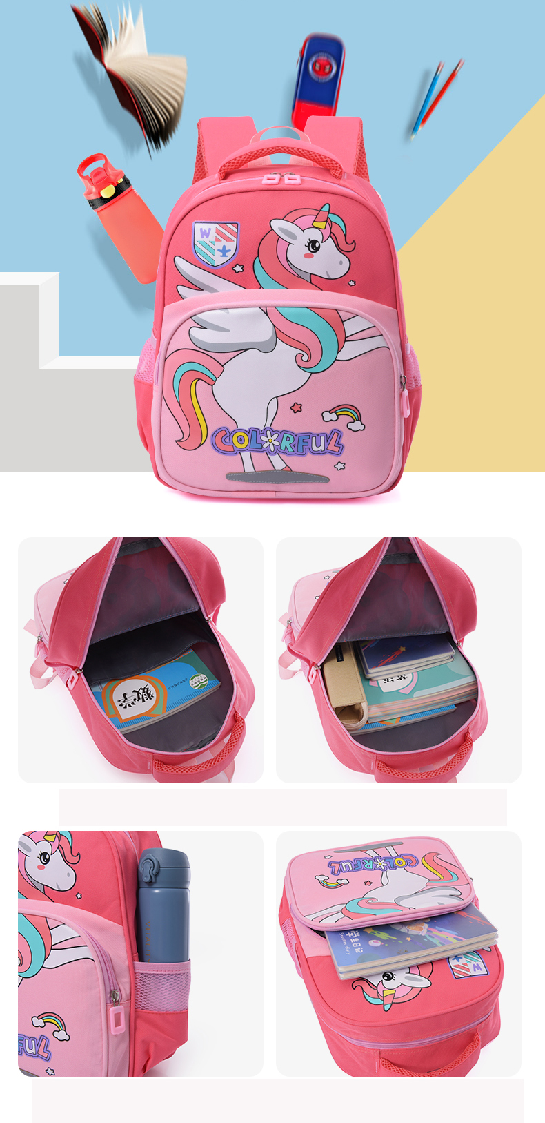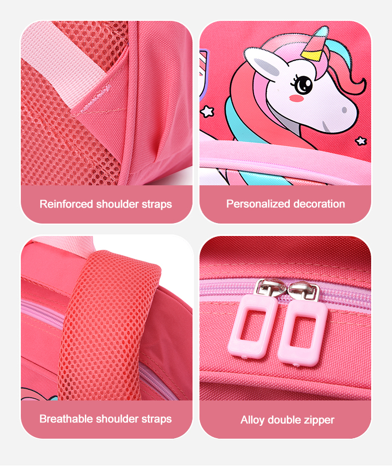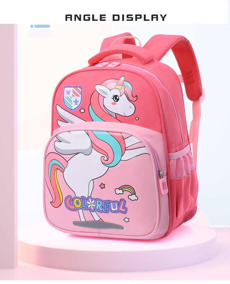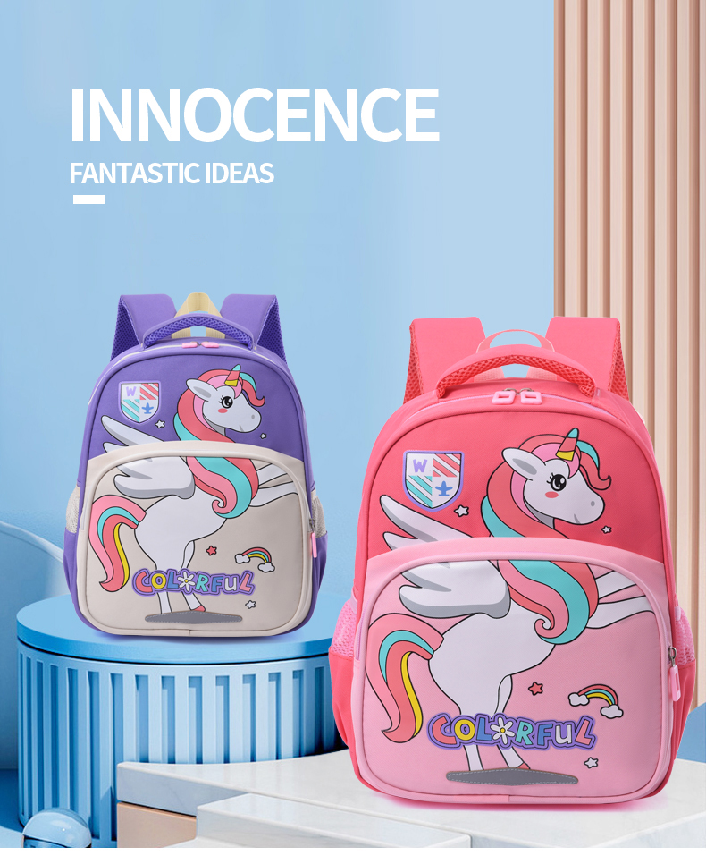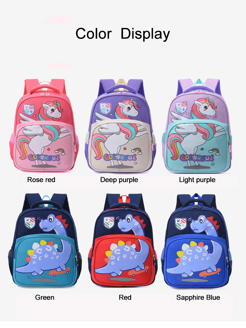 This cartoon-themed children's backpack offers two options: unicorn and dinosaur designs. It features waterproof capabilities, spacious compartments, lightweight construction, and night reflective strips.
