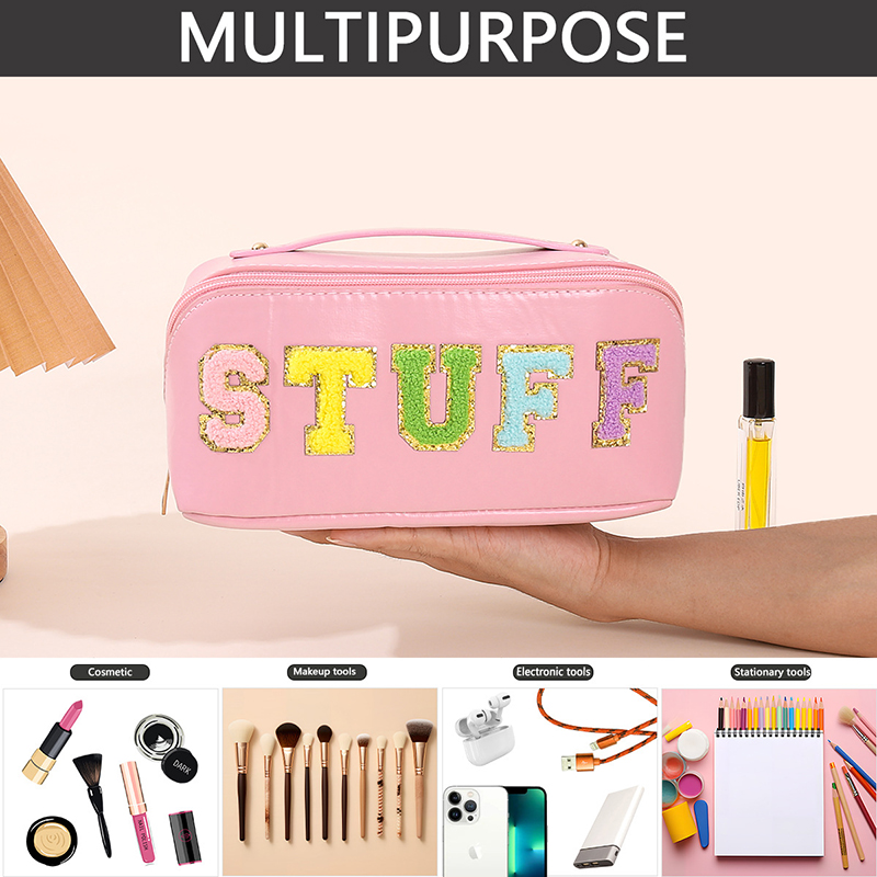 Large Capacity Cosmetic Bag- Super large double-main compartment design with makeup brush holder easy to fit full-size brushes, glasses, cosmetics, makeup tools, lipstick, eye shadow, foundation, makeup sponge, etc. Furthermore, the easy and large opening design makes it easy to take.