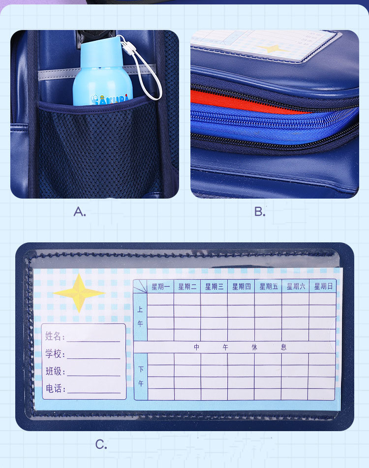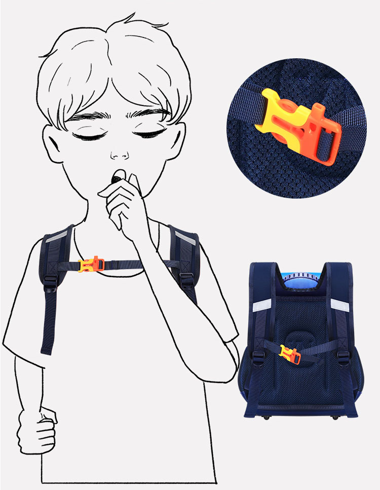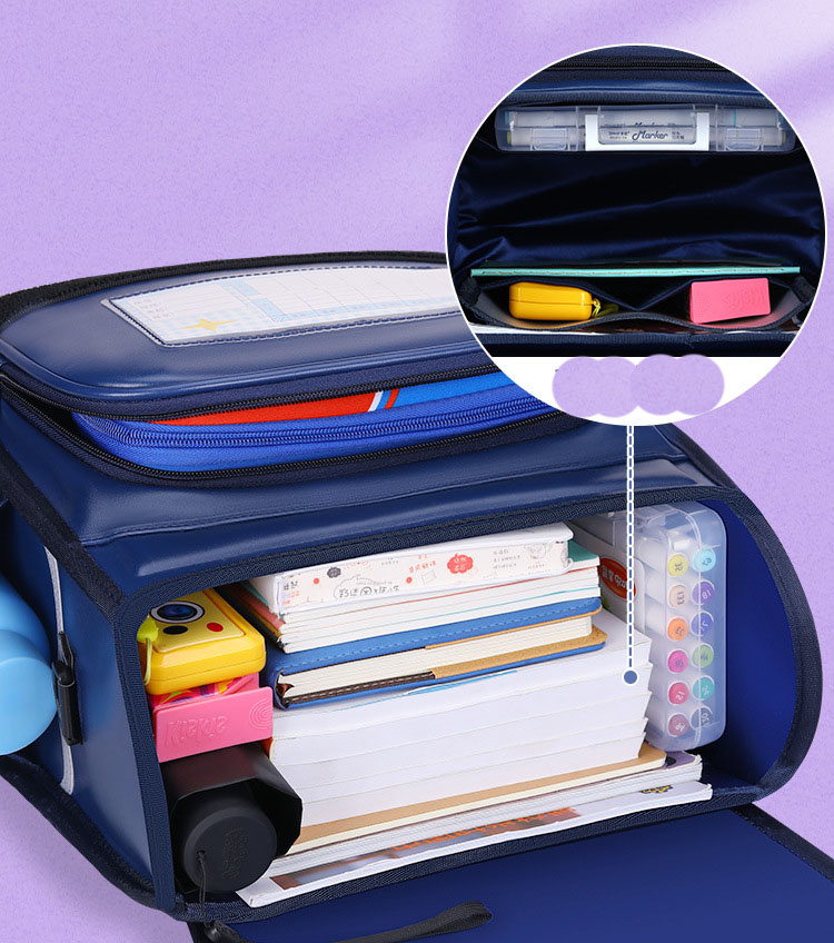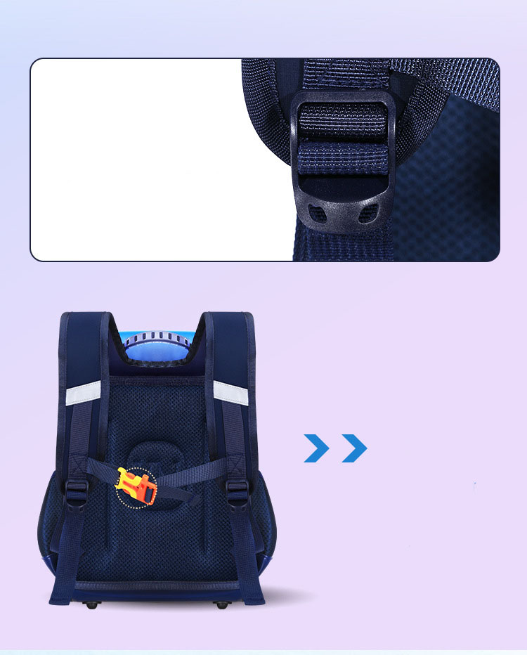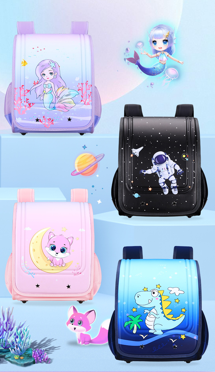 This schoolbag is not only stylish, but also has some great features for comfort and practicality! The high elastic shoulder strap design is great for ensuring the bag fits comfortably on the shoulders, The 3d back pad provides soft support for the back.The widened handle design is also a nice touch for comfortable carrying, especially if the child needs to hold the bag by the handle for extended periods of time. The lotus leaf anti-splash fabric is a smart choice for keeping the bag clean and dry, even in wet conditions. And the stable foot nails on the bottom of the bag can help keep it upright and prevent it from tipping over when set down. The safety reflective strips are a crucial feature for visibility, especially for children walking to and from school in low-light conditions. Additionally,the backpack features a cloth strap on the back that can be slipped over the trolley for easy transport,and it is equipped with secure fasteners at the bottom to keep it firmly in place.