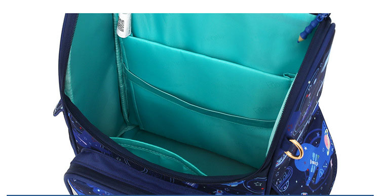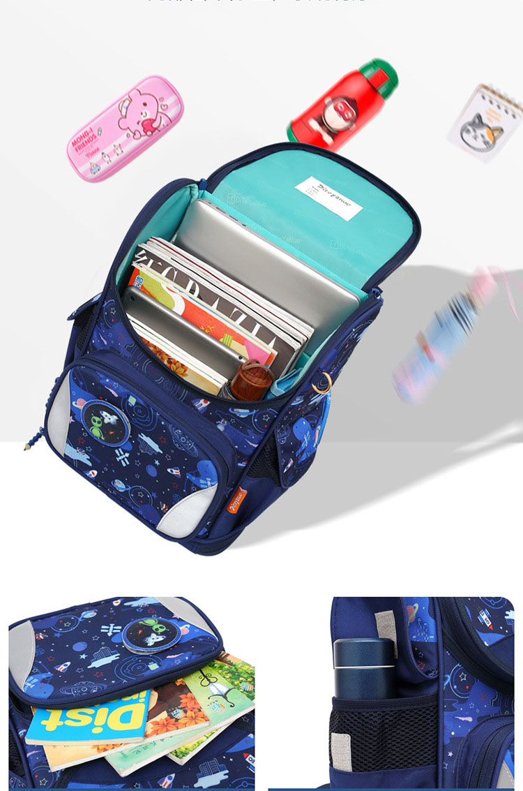 This backpack has a spacious main compartment that can accommodate textbooks, notebooks, and other essentials that children may need for school. In addition to the main compartment, there are also several pockets and compartments on the exterior of the backpack, including side pockets for water bottles or umbrellas, a front pocket for easy access to small items, and a hidden back pocket for valuables.