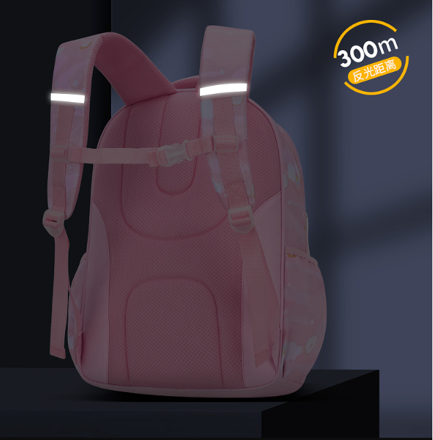 The back of the schoolbag is equipped with reflective strip material. When walking at night, the light is reflected by the lamp to warn the traffic Materials and reduce the travel risk. The reflective effect is produced when the reflective schoolbag passes through the lamp and other lights at night. The reflective distance can reach 300m, which plays a reassuring warning role