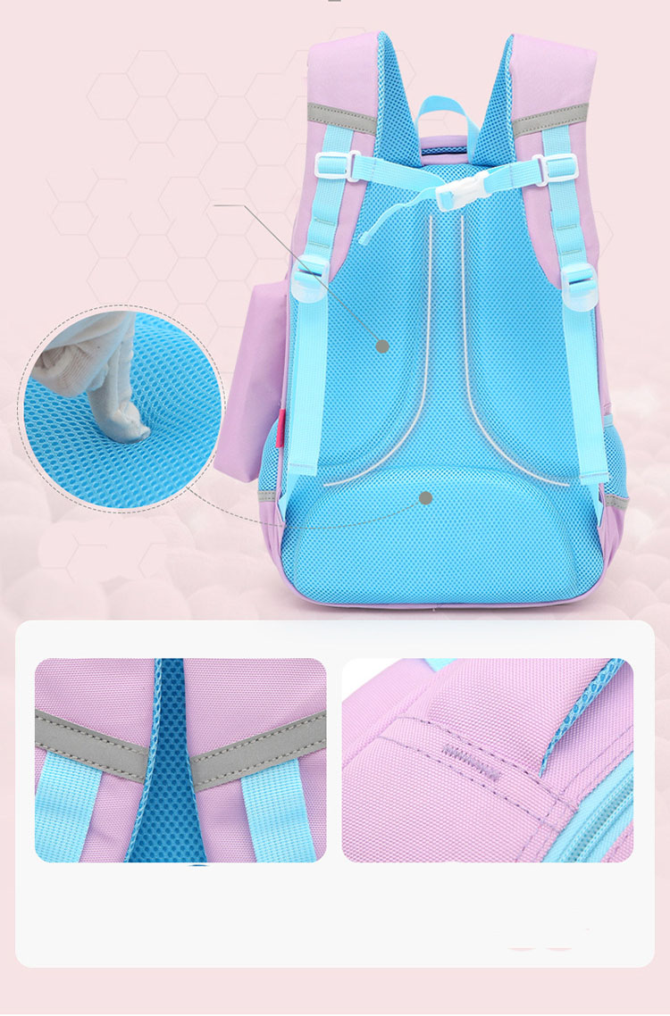 Honeycomb breathable, free breathing, air cushion design in the whole process, rapid heat dissipation, ventilation and load reduction, providing children with a more comfortable experience. The back groove of the bag guides heat dissipation, is soft and breathable, and the shoulder belt has reflective strips, which makes it safer and more secure. The handle is reinforced and durable
