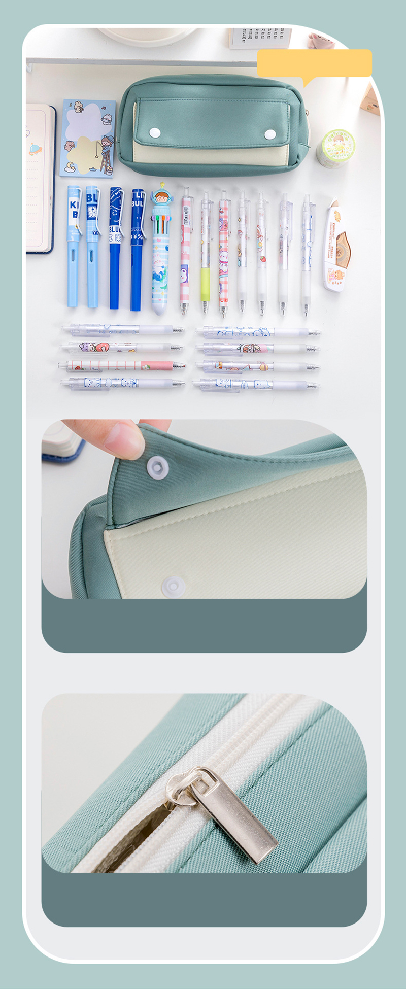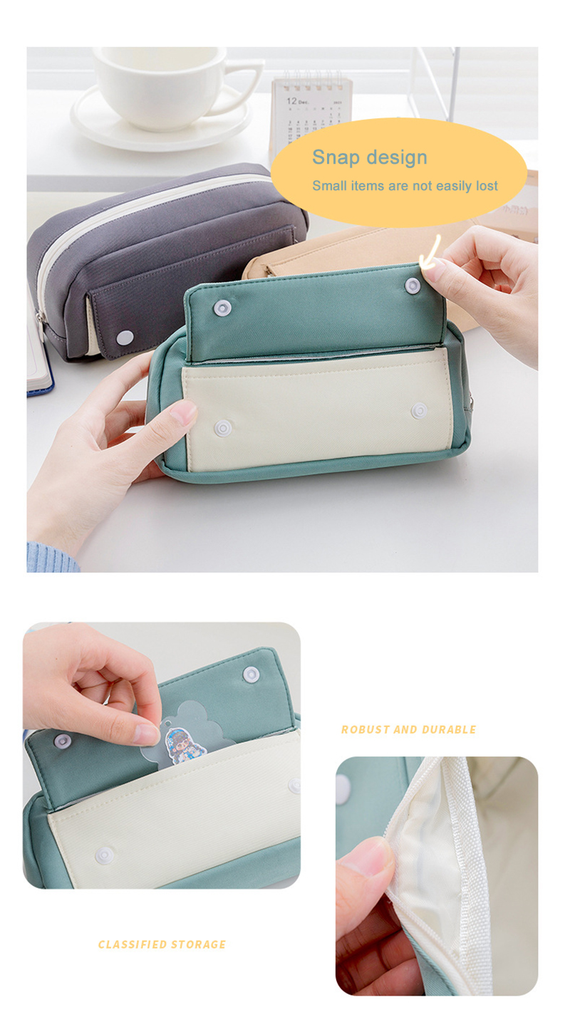 Secure Side Pocket with Snap Closure: Designed with a side pocket and snap closure, it allows you to securely store smaller stationery items such as erasers, small utility knives, and more. This prevents them from rolling around or cluttering the pouch's main compartment.